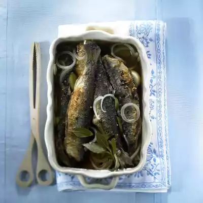 Peel onions and cut into rings. Cut cucumbers into slices. Layer fried herrings, onions and cucumbers in a form. Pour the cooled stock over them. Cover and leave to stand in a warm place for at least 24 hours