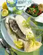 Take the fish out and keep it warm. Add wine and stock to the frying pan. Halve the chilli pepper, remove seeds, chop finely and add to the stock. Mix the starch with a little cold water and thicken the sauce with it. Season with salt, pepper and sugar. Form spinach into 8 balls, arrange on a plate with the fish and the sauce. Garnish with lemon wedges