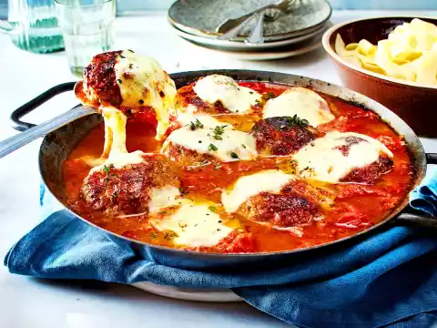 Place the meatballs in the sauce, spread the cheese on top and bake in a hot oven for about 15 minutes. Served with noodles.