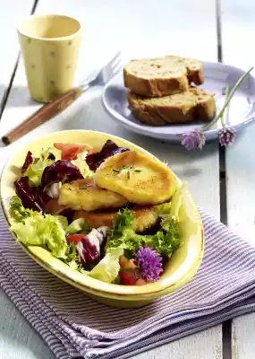 Heat 3 tablespoons of oil in a frying pan. Fry the mozzarella slices until golden brown, turning them over. Arrange on the salad. Garnish with chives. Onion bread tastes good with it.