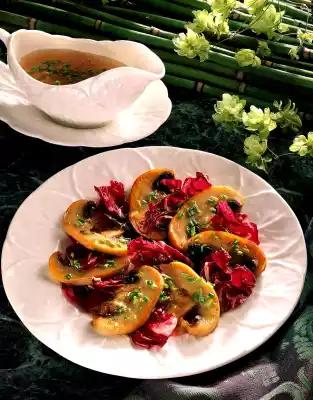 Mix vinegar, salt and pepper. Whip the oil into the mixture. Wash the chives, cut into fine rolls and stir in. Pour the vinaigrette over the salad.