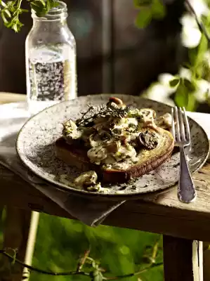 Toast the bread in portions. Add crème fraîche to the mushrooms and heat briefly. Arrange bread and mushrooms on plates, garnish with thyme