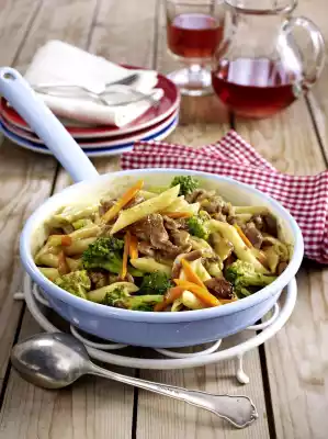 Cut broccoli into florets from the stalk and wash. Peel and wash the carrots and cut them into strips. Prepare pasta in boiling salted water according to package instructions. Heat the oil in a pan and fry the meat for about 6 minutes while turning it.
