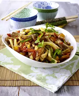 Wash and chop the coriander, except for something to garnish. Peel and finely chop the ginger. Fold both with nuts under the vegetables. Season to taste with soy sauce and Asian sauce.
