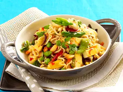 Add the pasta to the vegetables and fry for 2-3 minutes, turning. Deglaze with soy sauce and chilli sauce, heat up, season with salt and pepper. Fold in peanuts and serve. Garnish with coriander green.