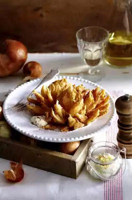 Heat the oil in a high pot (to 175 ° degrees). Fry the onions one after the other in hot frying oil for 5-7 minutes until golden brown. Take them out and let them drip off on kitchen paper.