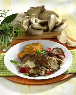 Place the Rösti on a baking tray lined with baking paper and bake in a preheated oven (electric range: 200 °C/ convection oven: 175 °C/ gas: level 3) for 15 minutes. Clean the oyster mushrooms with kitchen paper, halve if necessary.