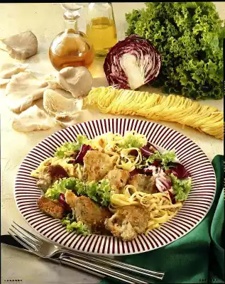 Cook the pasta in boiling salted water for about 8 minutes until al dente. Clean the mushrooms, rub carefully with kitchen paper and chop if necessary. Remove the crusts from bread and chop very finely. Whisk egg with salt and pepper. Turn the mushrooms first in the egg, then in the breadcrumbs. Fry in hot fat until golden brown. Clean and wash the salad and pluck into bite-sized pieces.
