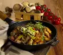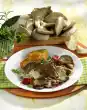 Coarsely chop the nuts. Mix oil and vinegar. Season with salt and pepper. Add nuts. Drain noodles, rinse with cold water and drain well. Mix pasta, salad and walnut vinaigrette. Arrange on plates with the mushrooms