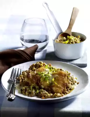 Heat 4 tablespoons of oil in a frying pan. Fry the fish for 4-6 minutes while turning. Add the leek to the lentils about 5 minutes before the end of the cooking time. Add cream and season with salt. Stir in mustard and vinegar.