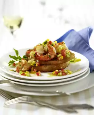 Wash the shrimps and pat them dry. Heat 2 tablespoons of oil in a frying pan and fry the prawns for 2-3 minutes, turning them over. After 1-2 minutes add garlic and parsley. Remove from heat and season with salt and pepper. Spread 2 slices of bread on 4 plates and place the prawns on each. Spread gazpacho salsa on top and garnish with the rest of the parsley. Serve immediately