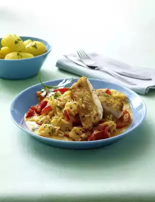 Cut pike-perch fillet into 8 pieces and sprinkle with salt. Heat the fat in a frying pan and fry the pike-perch fillets for approx. 4 minutes, turning them over. Mix starch and 2 tbsp. cold water, add sour cream and stir into the sauerkraut.