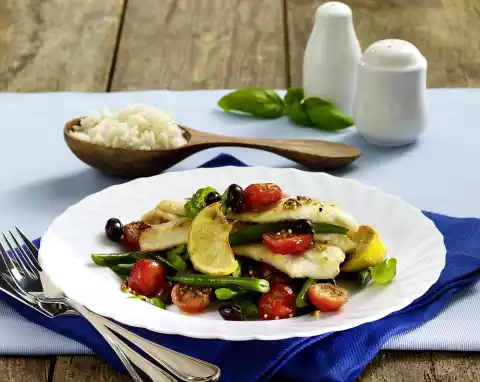 In the meantime, wash the plaice fillets, dab dry and season with salt, pepper and lemon juice. Add tomatoes, mustard, beans, basil and olives to the lemon wedges. Heat 1 tablespoon of oil in another pan and fry the plaice fillets for 3-4 minutes, turning them once. Season vegetables with salt and pepper and arrange them with the plaice fillets. Garnish with basil. Serve with rice