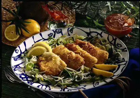 Press the breading lightly. Fry the fish fillet for about 4 minutes on each side in hot oil. Heat the fat. Steam leek for approx. 6 minutes while turning. Wash and drain the mung bean sprouts, add and steam for another 2 minutes.