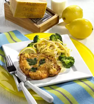 Whisk the egg in a deep plate. Season meat on both sides with salt and pepper. Turn the cutlets in the egg first, cover with 1 parsley leaf each and turn in the parmesan mixture. Heat oil in a pan and fry meat for about 5 minutes on each side. Take out and keep warm. Meanwhile cook the pasta in boiling salted water for about 8 minutes. 5 minutes before the end of the cooking time, add broccoli to the pasta water and bring to the boil. Sauté the shallots and garlic in the cooking fat. Deglaze with broth. Stir in cream and lemon peel. Bring sauce to the boil and season with salt, pepper and sugar. Let it boil down a little bit at medium heat. Drain pasta and broccoli, drain and mix with the sauce.