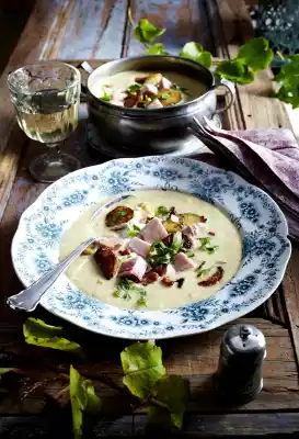 Add cream and sour cream to the soup, puree finely, season with nutmeg, salt and pepper. Serve the soup sprinkled with remaining fried potatoes, smoked pork loin and celery green.
