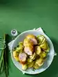 Wash the potatoes the day before, cook in boiling water for about 20 minutes. Drain, rinse with cold water, peel. Let potatoes cool down overnight. The next day put 1 litre of water, vinegar and smoked pork in a pot.