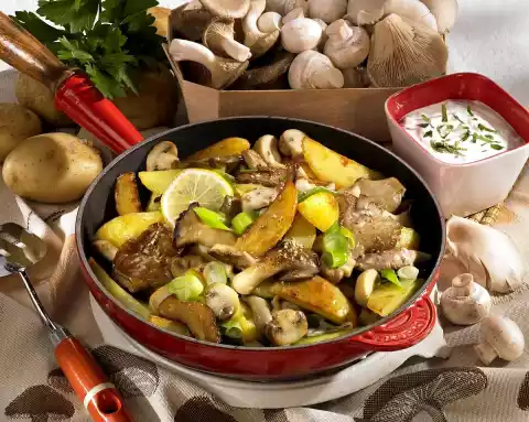 Fry spring onions and mushrooms in it. Deglaze with wine and stock, stir in herbs from Provence and let it boil down for about 3 minutes. Fold in the potatoes and season to taste with salt, pepper and a few drops of lemon juice.
