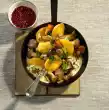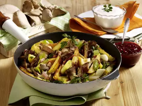 Clean and trim the mushrooms. If necessary, cut large side-pieces in half lengthwise. Pluck oyster mushrooms roughly. Take out potatoes and ham and keep warm. Put mushrooms, onion and leek into the pans and fry for 5-7 minutes, season with salt and pepper.