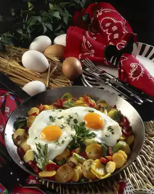 Season with salt and pepper. Fry eggs as fried eggs in hot oil. Season with salt. Wash parsley, dab dry and chop. Serve the pan with the fried eggs. Sprinkle with parsley