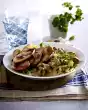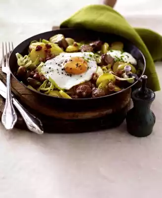 Put 20 g clarified butter into the bacon pan and heat it up. Add mushrooms, fry while turning, season with salt and pepper, add to the potatoes. Add leek to the frying fat and fry while turning. Add to the potatoes. Fry the sausage in the cooking fat and add to the potatoes. Mix everything well, season with salt and pepper