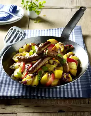 In the meantime, heat the oil in a second pan and fry the sausages for 3-4 minutes, turning them over. Sprinkle potato pan with coarse salt. Arrange some sausages on top. Garnish with remaining marjoram. Add the remaining sausages