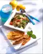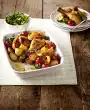 Peel, wash and slice the potatoes. Clean, wash and cut the vegetables into pieces. Season meat with salt and pepper. Heat 3 tablespoons of oil in a large pan. Fry the potatoes and carrots at medium heat for about 15 minutes.
