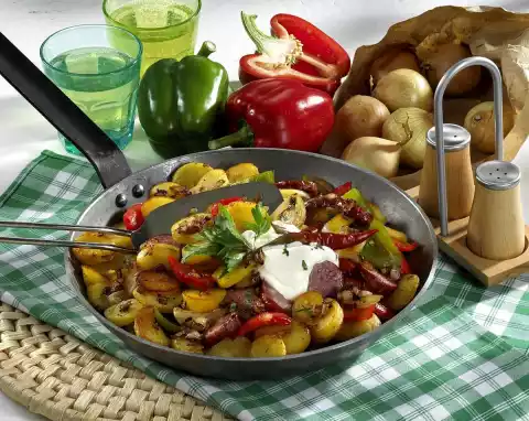 Peel and chop the onions. Cut the cabanossi into slices. Heat 2 tablespoons of oil. Brown the onions and the bell peppers. Season with salt and pepper. Fry the cabanossi briefly. Cut potatoes into slices.