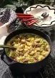 Pour everything into a pan, season if necessary. Serve with crème fraîche, pickled peppers and parsley.
