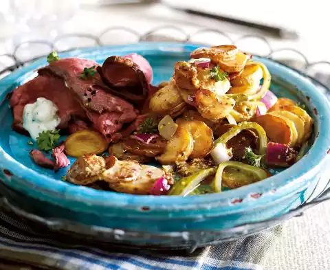 Roast in a hot oven for 35-40 minutes. It is best to insert a roast thermometer into the thickest part of the roast beef. If it shows a core temperature of 55-65 °C, the meat is pink inside. Remove the meat and let it cool down.