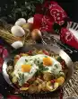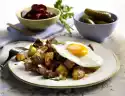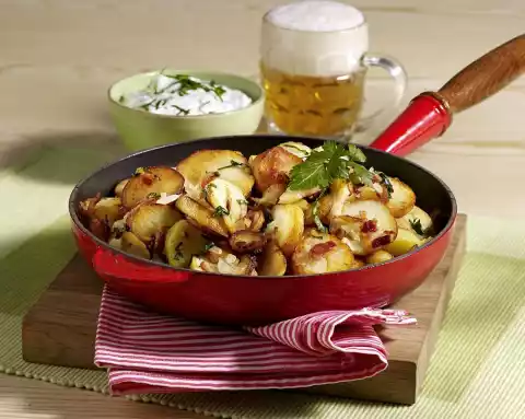 Add bacon and onions and fry for another 5 minutes. Fold in the remaining parsley. Arrange the fried potatoes in a pan. Garnish with parsley. Add the herb quark.