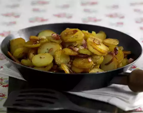 Heat 1 tablespoon of lard in bacon fat. Fry half of the potatoes for about 5 minutes, turning them until golden brown. Season with salt and pepper, add half of the onion cubes and fry for another 5 minutes. Season again. Prepare the remaining fried potatoes in the same way. Put all potatoes in the pan, add bacon again and toss with the potatoes