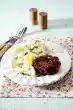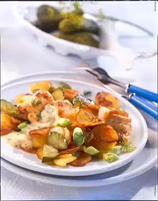 Remove fish from the pan and keep warm. Add the fried potatoes to the frying fat and fry all around for about 10 minutes until golden brown. Approx. 5 minutes before the end of the frying time add spring onions and gherkins and fry with them.