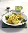 Add the fish and warm it up again. For the sauce, stir the sauce powder into 1/4 litre of lukewarm water with a whisk and bring to the boil. Season to taste with mustard and sugar. Chop dill finely and stir in.