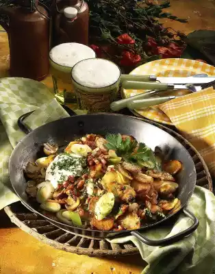 Dice the bacon. Wash, clean and halve the mushrooms. Heat the oil in a pan and fry the fried potatoes, bacon, leek and mushrooms for about 10 minutes while turning them until crispy. Season with salt and pepper.