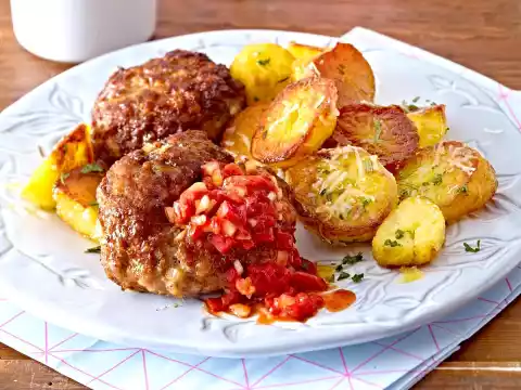 Wash and chop the parsley. Grate the parmesan. Sprinkle potatoes with parmesan and parsley and bake in a hot oven for another 2-3 minutes. Arrange everything.
