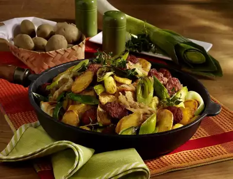 Fry the potatoes in it all around for about 10 minutes until crispy. Take out and drain on kitchen paper. Put 1 tablespoon of oil into the still hot pan and fry the ends of the meads well in it. Add the leek and onion rings and fry.