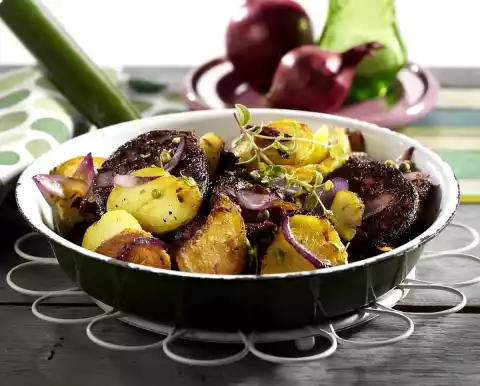 Remove the pellet from the blood sausage. Cut the sausage into slices. Take the fried potatoes out of the pan and fry the sausage briefly on both sides in the frying fat. Add potatoes and marjoram again and mix carefully.