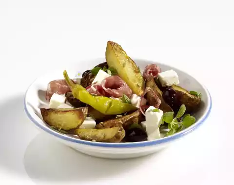 Wash potatoes thoroughly, cut into slices. Heat oil in a large pan. Fry potatoes vigorously for about 25 minutes, turning. Cut feta into cubes. Roll up the sausage slices individually and cut into small rolls.