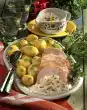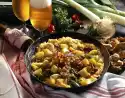 Fry the last 3 minutes with the bacon. Drain the potatoes, rinse with cold water, peel and slice. Heat 2 tablespoons of oil in a pan and fry the potatoes for 10-15 minutes until golden brown.