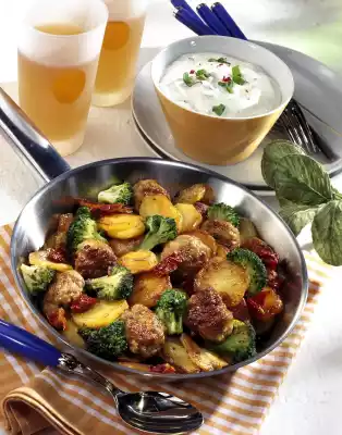 Add the remaining oil to the frying fat. Fry the potatoes for about 20 minutes. Clean, wash and cut broccoli into small florets, add to the potatoes and fry for 10 minutes. Season with salt and pepper. Add meatballs to the potatoes and heat up briefly. Clean and wash spring onions and radishes. Cut spring onions into thin rings and radishes into fine sticks. Stir both into the sour cream. Chop the tomatoes and sprinkle over the potatoes.