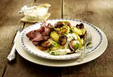 Heat clarified butter in a large, coated pan. Fry the potatoes for about 10 minutes while turning. Season with salt and pepper. Finally add spring onions. Arrange the fried potatoes, 5 slices of roast beef and horseradish romoulade each and sprinkle with marjoram and coarse black pepper.