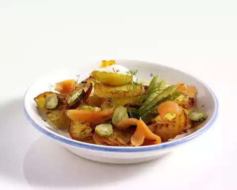 Wash the dill, shake dry. Pluck little flags from the stalks, except for something to garnish, and cut finely. Cut salmon into strips. Arrange roast potatoes and one tablespoon of crème fraîche each on plates, sprinkle with salmon, dill and cucumber slices.