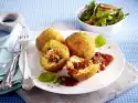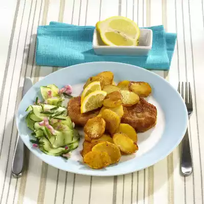 Turn the cutlets in flour, egg and breadcrumbs. Heat clarified butter in a frying pan and fry the escalopes for 3-4 minutes on each side. Arrange potatoes, schnitzel and cucumber salad on plates and serve.