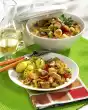 Cut the savoy cabbage quarters into thin strips. Peel and finely dice 1 onion. Heat 1 tablespoon of oil in a frying pan and sauté the onion cubes in it. Add the savoy cabbage and stock, cover and stew for about 10 minutes. Heat the rest of the oil in a pan and fry the sausages in it over medium heat for about 8 minutes while turning. Drain the potatoes and let them evaporate. Bring milk to the boil. Coarsely mash potatoes and mix with the milk. Season with salt and nutmeg. Wash remaining apple, dab dry and cut into sticks. Cut remaining onion into rings.