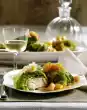 Sauté the spring onions briefly in the hot frying fat. Deglaze with 1/4 l water, bring to the boil. Stir in broth, crème fraîche and sauce thickener, bring to the boil briefly. Season to taste with salt and pepper. Heat prawns in the sauce. Serve with coconut rice. Garnish with lemon and coconut chips if desired