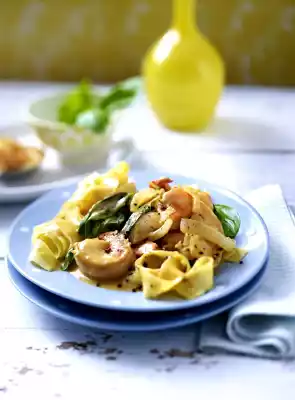 Bring approx. 4 litres of salt water (approx. 1 teaspoon salt per litre) to the boil. Wash the basil, shake dry, pluck the leaves from the stalks. Prepare pasta in boiling salted water according to package instructions. Heat butter in a pot. Fry the rest of the onions until translucent. Dust with flour and sauté briefly. Add the shrimp stock through a sieve. Add cream as well. Bring to the boil and simmer for about 3 minutes. Season sauce with salt and pepper
