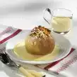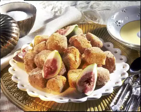 Quarter figs and spread jam. Put the figs aside. Whisk eggs. Turn pudding cubes first in remaining flour, then in whisked egg and finally in breadcrumbs carefully. Heat oil in a large pan and fry 7-8 pudding cubes in each pan until golden brown all around. Mix the remaining sugar and cinnamon and roll the pudding cubes in it. Arrange warm pudding cubes with figs and mint leaves and serve
