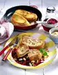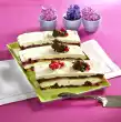 Bring 100 g sugar, 80 g flour and milk to the boil in a saucepan, stirring constantly, and let it swell to a thick pudding. Add butter. Pour the mixture about 3 cm thick into a rectangular form (30 x 20 cm) rinsed with cold water. Brush the surface smooth. Cover and put in a cool place for about 4 hours. Cut into 2-3 cm cubes with a knife dipped in hot water. Heat the jam in a small pot.