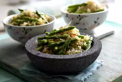 Heat the oil in a wok or large frying pan. Fry the chilli, onions, garlic and asparagus over medium heat for 1-2 minutes while stirring. Add rice and fry briefly. Season to taste with soy sauce, fish sauce, sugar and possibly salt and pepper.